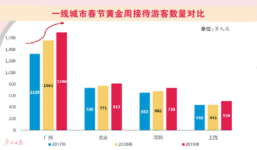 廣州日報數據和數字化研究院(GDI智庫)日前發布廣州“反向過年”大數據報告。高德地圖位置大數據顯示,2019年春節期間,在北上廣深等城市中,從小年(臘月廿三、廿四)至大年三十(除夕),前往廣州的人數超過北京、上海、深圳,成為“反向過年”人數最多的一線城市。廣州2019年春節黃金周旅客數量超上海三倍北京兩倍,旅游收入為上海1.8倍北京1.5倍。廣州塔及周邊成熱門景區,商圈游客數量翻一番。