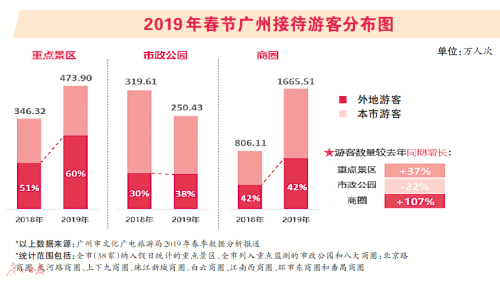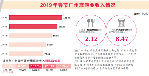 根據廣州市假日期間納入監測的餐飲、零售企業情況顯示,黃金周七天納入監測的廣州市13家重點餐飲企業春節期間營業收入2.12億元,同比增長達10.10%,創今年來的最高增幅;春節期間廣州市14家重點零售企業春節期間營業收入8.47億元,同比增長3.4%,為近三年來首次出現增長。