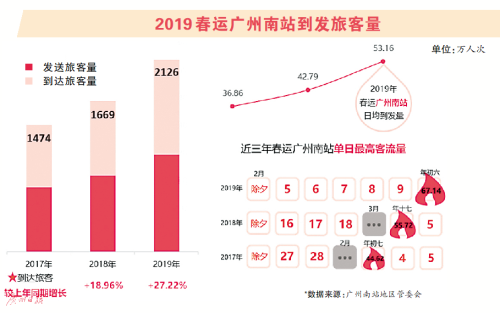2019年春運期間(1月21日至3月1日),廣州南站到發旅客2126.37萬人次,日均旅客到發量53萬人次,同比增長24.23%,居全國第一。另外,今年廣州到達旅客量達1050.75萬人次,較上年同期增長27.22%,創近三年來最大增幅,春運期間來廣州的旅客數不斷攀升。廣州南站客流峰值出現在2月10日(年初六),到發客流量達67.14萬人次,較去年春運峰值(55.72萬人次)上升20.49%。