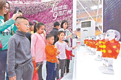 海心沙AI花市現場,小朋友聚精會神地看著機器人跳舞。廣州日報全媒體攝影記者 蘇俊杰 攝