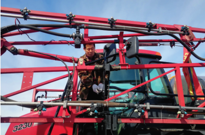 3月7日,黑龍江省孫吳縣樺林現(xiàn)代農(nóng)機(jī)專業(yè)合作社理事長吳德顯正在檢修大型噴藥機(jī) 王建攝/本刊