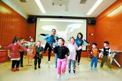 在通州區(qū)圖書館,孩子們跟著“故事人”模仿蝙蝠飛行。