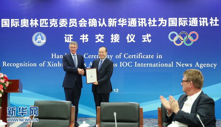 新華社北京4月12日電 國際奧委會國際通訊社證書交接儀式12日在北京舉行。新華社副社長嚴(yán)文斌代表新華社接受證書,國際奧委會新聞委員會主席、媒體運行部總監(jiān)安東尼·埃德加代表國際奧委會主席巴赫遞交證書。