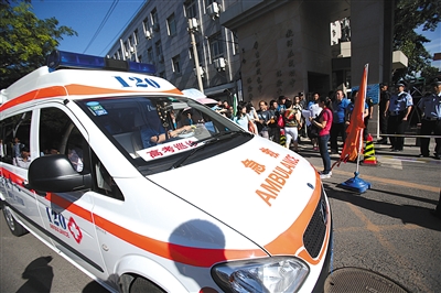 2015年6月,一輛120救護車在高考考場外隨時待命。資料圖片/新京報記者 王貴彬 攝