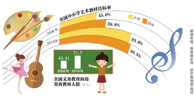 根據教育部公布的最新數據,2018年全國小學藝術器材達標率提高到93.8%,初中提高到95.5%;2018年全國義務教育階段美育教師人數增加到71.7萬人。比10年前有較大幅度提高。