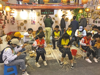學生藝術實踐工作坊,來自福建安溪的小學生展示竹藤編。新京報記者 馮琪 攝