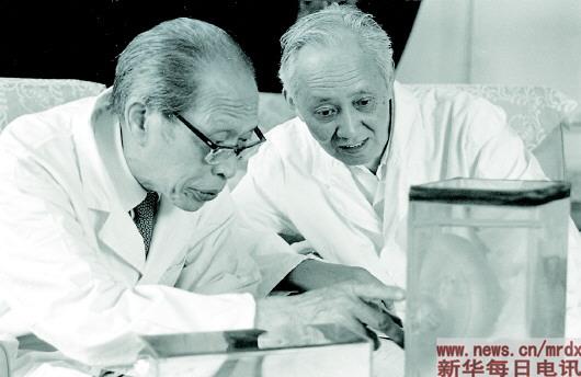夏穗生教授(右)和裘法祖教授在一起研究肝移植病例。(1986年6月30日發) 新華社記者于澄建攝