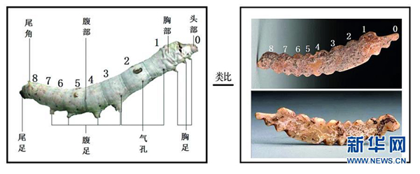 這是河南鞏義雙槐樹遺址出土的牙雕蠶與現代家蠶的比對圖(資料照片)。新華社發(鄭州市文物考古研究院提供)