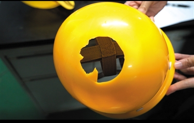 15元安全帽測試后現破洞。新京報記者 唐躍 攝