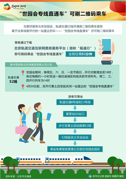 乘客通過(guò)下載北京軌道交通互聯(lián)網(wǎng)票務(wù)服務(wù)平臺(tái)(簡(jiǎn)稱(chēng)“易通行”),即可刷碼乘坐“世園會(huì)專(zhuān)線直通車(chē)”,全程僅需82分鐘。