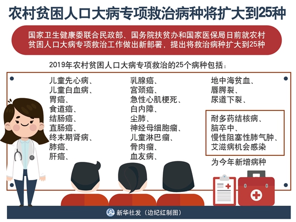 記者從國家衛(wèi)健委獲悉,2019年農村貧困人口大病專項救治的25個病種包括:兒童先心病、兒童白血病、胃癌、食道癌、結腸癌、直腸癌、終末期腎病、肺癌、肝癌、乳腺癌、宮頸癌、急性心肌梗死、白內障、塵肺、神經母細胞瘤、兒童淋巴瘤、骨肉瘤、血友病、地中海貧血、唇腭裂、尿道下裂、耐多藥結核病、腦卒中、慢性阻塞性肺氣腫、艾滋病機會感染。其中,后四種為今年新增病種。