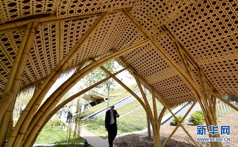 5月16日,游人在北京世園會國際竹藤組織園參觀。 當日,由國際竹藤組織主辦的榮譽日活動在北京世園會園區的國際竹藤組織園舉行。 新華社記者 李欣 攝