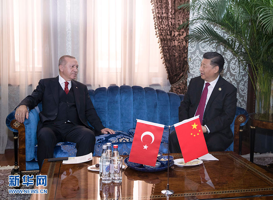 6月15日,國(guó)家主席習(xí)近平在杜尚別會(huì)見土耳其總統(tǒng)埃爾多安。 新華社記者 王曄 攝