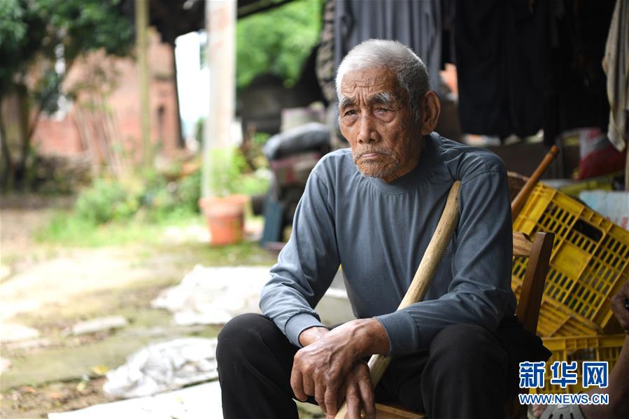 全州縣鳳凰嘴渡口旁,蔣濟(jì)勇老人向再走長(zhǎng)征路的記者們講述自己11歲經(jīng)歷的湘江戰(zhàn)役(6月29日攝)。新華社記者 周華 攝