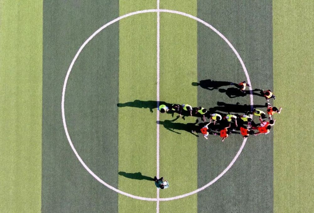 2019年4月17日,太行山深處,初中組男子足球隊隊員在分組對抗賽開始前互相擊掌。(新華社記者詹彥 攝)