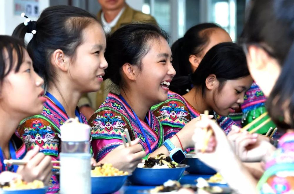 2017年11月1日,廣西融水苗族自治縣民族中學的學生們在吃營養餐。該縣共有5.6萬名學生享受免費營養餐。(新華社記者黃孝邦 攝)