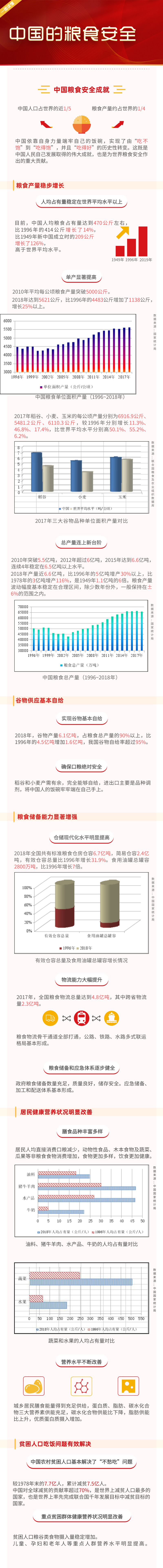 國務院新聞辦10月14日發表《中國的糧食安全》白皮書。白皮書約1.2萬字,分為前言、中國糧食安全成就、中國特色糧食安全之路、對外開放與國際合作、未來展望與政策主張、結束語等6部分。白皮書全面總結反映了我國糧食安全取得的歷史性成就,重點闡述了1996年特別是黨的十八大以來我國在保障糧食安全方面實施的一系列方針政策和舉措辦法,介紹了中國糧食對外開放和國際合作的原則立場,并提出了未來中國糧食問題的政策主張。