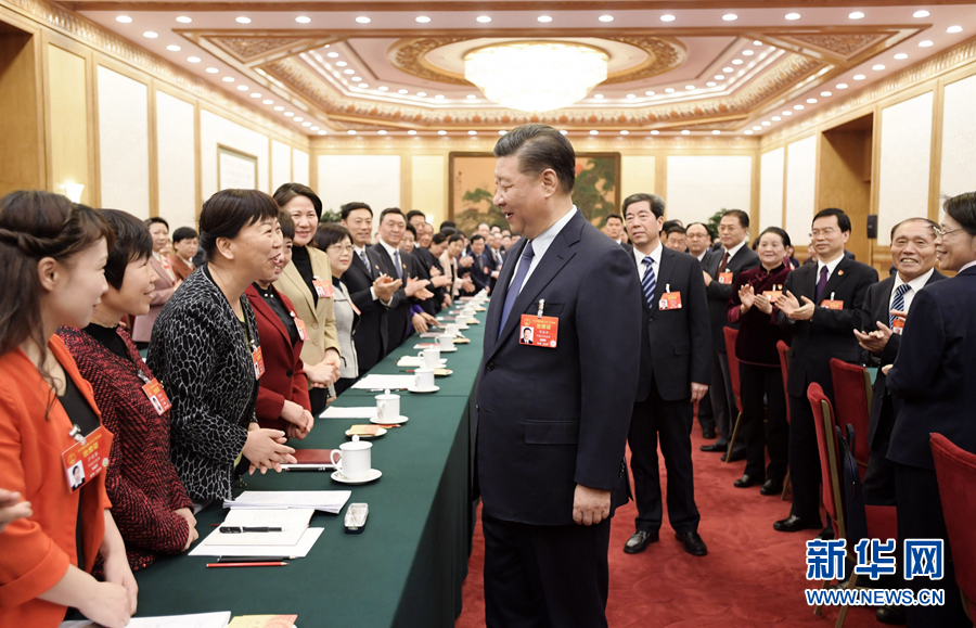 3月8日,中共中央總書記、國家主席、中央軍委主席習近平參加十三屆全國人大二次會議河南代表團的審議。在“三八”國際勞動婦女節到來之際,習近平代表黨中央,向參加全國兩會的女代表、女委員、女工作人員,向全國各族各界婦女,致以節日的祝賀和美好的祝福。這是習近平同女代表親切握手。新華社記者 謝環馳 攝
