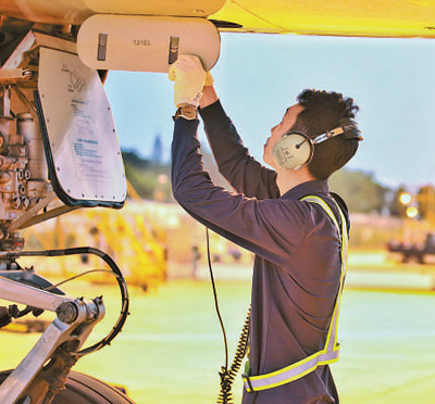 10日,機(jī)務(wù)人員進(jìn)行起飛前的各項(xiàng)檢查。當(dāng)日,海口美蘭機(jī)場飛往北京大興機(jī)場的首個航班順利起航。朱榮鵬 紀(jì)巧珠攝影報道(影像中國)