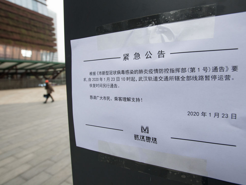 1月23日在武漢地鐵汪家墩站出口拍攝的地鐵停運通告(新華社記者 肖藝九 攝)