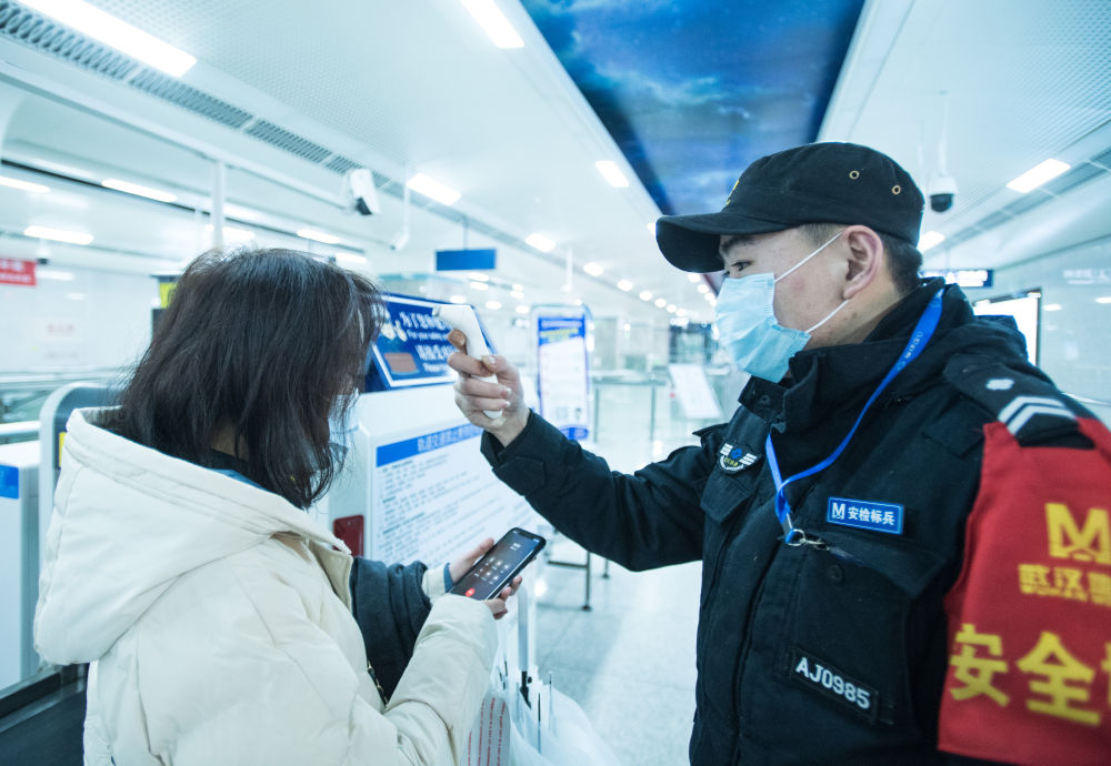 1月23日上午9時許,在武漢地鐵8號線汪家墩站,工作人員對旅客進行體溫檢測。(新華社記者 肖藝九 攝)