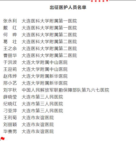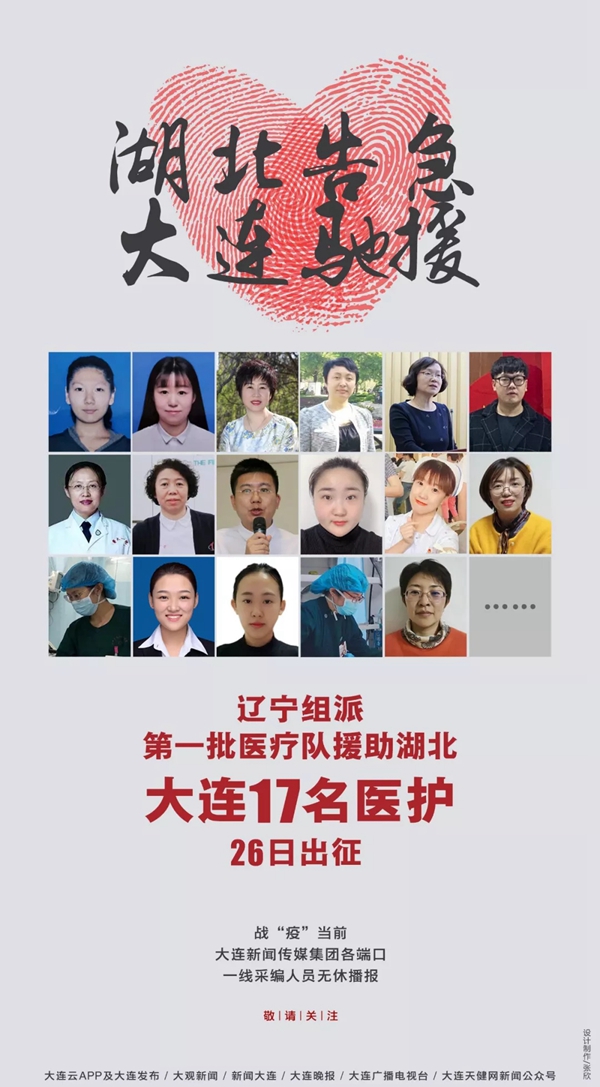 記者從大連市衛生健康委獲悉,我市確定了17名醫護人員參與到遼寧第一批援助湖北應對新型冠狀病毒感染的肺炎疫情醫療隊中,今日早上將出征馳援。