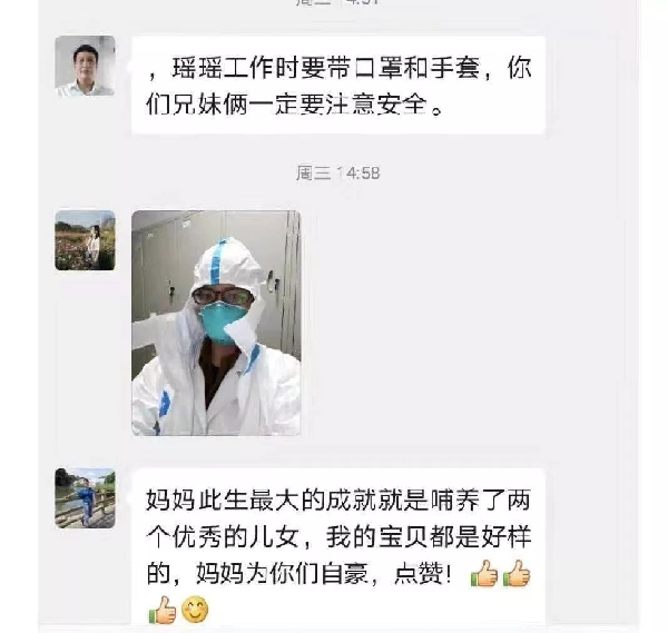 “我爸媽其實是挺擔心我們的,他們每天在家也都在關注肺炎的相關新聞,知道危險性,但從來沒有一句阻攔的話。我爸是一名老黨員了,他經常對我和妹妹說,能用所學幫到社會是一件光榮的事情?!焙日f。