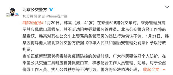 1月31日,韓某因侮辱他人被北京公交警方依據《中華人民共和國治安管理處罰法》予以行政拘留。當前正值新型冠狀病毒肺炎疫情防控的關鍵時期,廣大市民要做好個人防護,在乘坐公共交通工具時應自覺佩戴口罩,積極配合工作人員管理、勸導。對于公然侮辱工作人員、擾亂公共秩序等不法行為,警方將堅決依法處理。