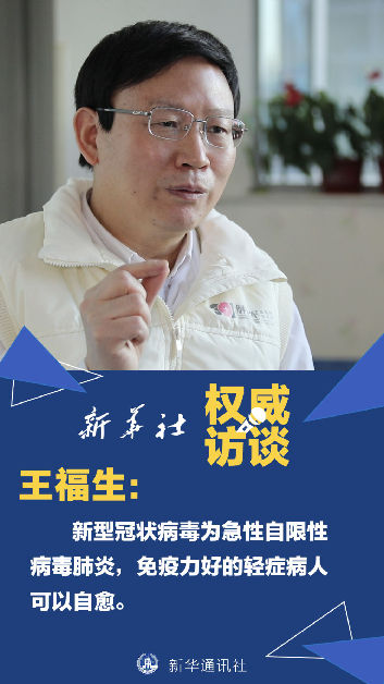 王福生:給大家普及一個概念,新型冠狀病毒肺炎它本身是一種急性自限性的疾病。什么叫自限性的呢?有的輕癥病人,他不經過治療可以自己好,其它重癥病例通過治療才能恢復。這個過程中間,他有一種叫自己好的“自愈”,所以說我覺得“自愈”加上“治愈”,如果他癥狀輕,肺部的病變不嚴重,免疫力又比較好,這樣通過自身抗病毒的能力,就很快地把病毒控制了,但這可能得有3周左右。