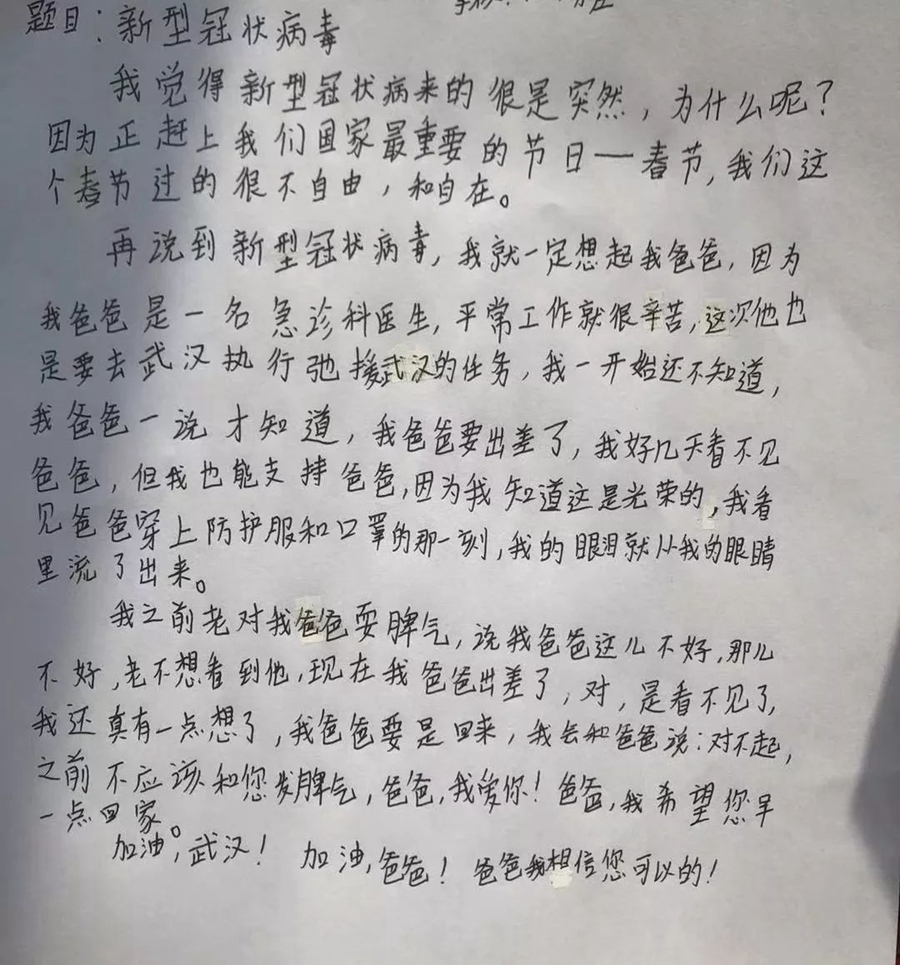 信里他先反思了一下自己,說以前盼望著爸爸上班,不希望爸爸在家管他。現(xiàn)在爸爸去前線,我想到危險(xiǎn)性,現(xiàn)在又特別希望爸爸安安全全地回家,然后還說了一句,爸爸我愛你!以前從來沒有過。我跟他說,我希望你在生活和學(xué)習(xí)中面對(duì)困難,無所畏懼,一直向前,我還說爸爸不一定是你的驕傲,但一定要做你的榜樣。