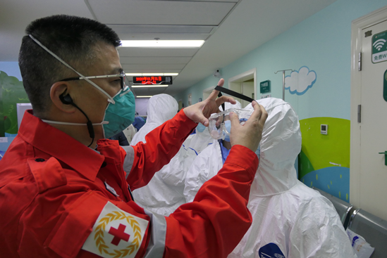上海醫療隊隊員們互相在防護服上寫名字(拍攝者:隊員王瑞蘭)