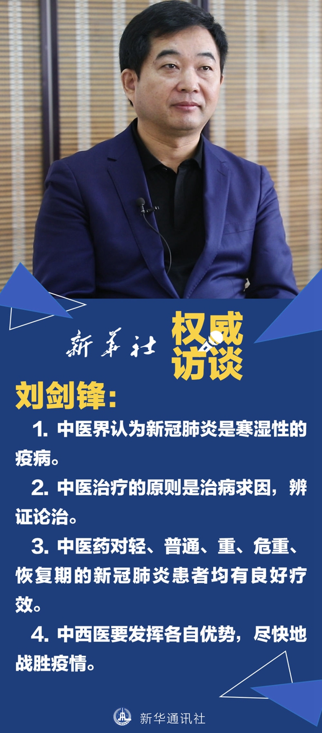 劉劍鋒:目前來講中醫藥在整個新冠肺炎的防治中發揮了非常好、非常大的作用。2月17日舉行的國務院聯防聯控機制新聞發布會發布的數據顯示,全國中醫藥參與救治的新冠肺炎確診病例共計60107例,占比為85.20%,對輕、普通、重、危重、恢復期的患者均有良好療效。