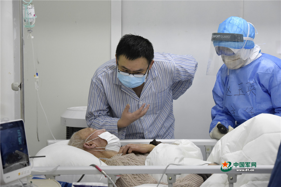 在病房,萬先生當“翻譯”,幫助醫護人員和只會講方言的老年患者交流。中國軍網記者范顯海 攝