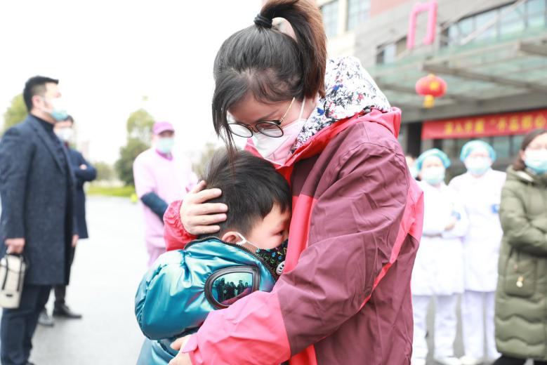 孫曉蘭緊緊摟住前來送行的兒子。江蘇南京醫(yī)科大學附屬逸夫醫(yī)院供圖