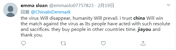 推特用戶emma sloan說:病毒將會(huì)消失,人類將會(huì)獲勝。我相信中國將會(huì)打敗病毒,因?yàn)橹袊嗣癫扇×藞?jiān)決且富有犧牲精神的行動(dòng)。他們給其他國家的人民爭(zhēng)取了時(shí)間。加油,謝謝你們。