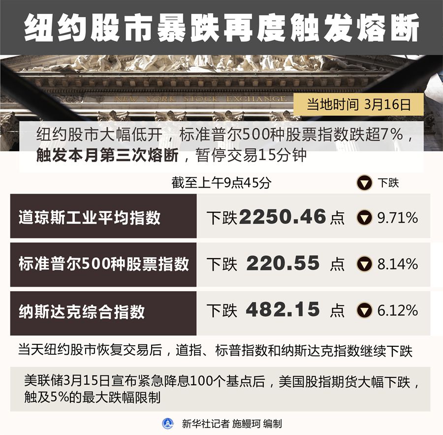 由于新冠肺炎疫情在美國持續擴散引發市場廣泛擔憂,紐約股市16日開盤暴跌,并再次觸發7%的熔斷點。交易重啟后跌幅擴大,收盤時紐約股市三大股指均暴跌超過11%。