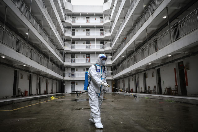 3月27日,武漢軟件工程職業學院康復驛站,工作人員在進行消殺。中青報·中青網記者 趙迪/攝