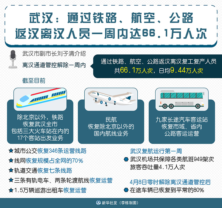 新華社武漢4月15日電(記者李偉、王作葵)武漢市副市長劉子清介紹,離漢通道管控解除一周內,通過鐵路、航空、公路返漢離漢復工復產人員共66.1萬人次,日均9.44萬人次。
