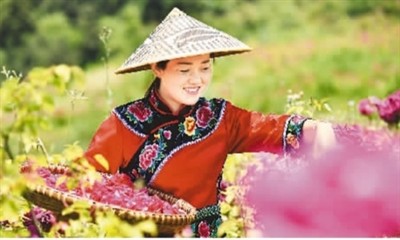 5月3日,村民在貴州省銅仁市松桃苗族自治縣黃板鎮臘沖村玫瑰產業園采收玫瑰花。 龍元彬攝
