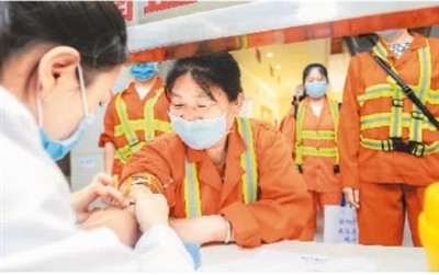 5月3日,環衛工人正在重慶市沙坪壩區一醫院接受采血檢查。張錦輝攝(人民視覺)
