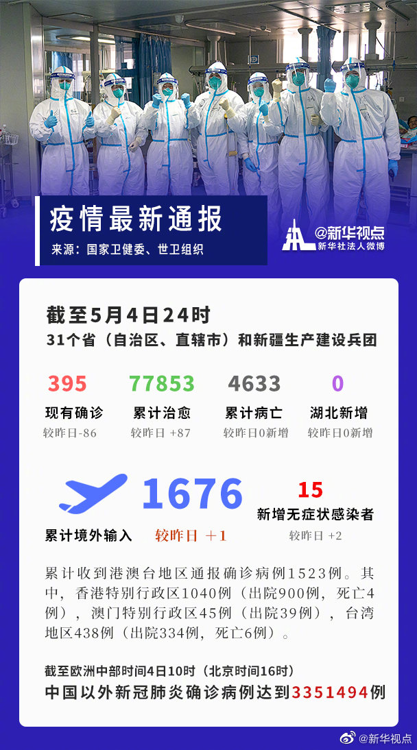 截至5月4日24時,據31個?。ㄗ灾螀^、直轄市)和新疆生產建設兵團報告,現有確診病例395例(其中重癥病例29例),累計治愈出院病例77853例,累計死亡病例4633例,累計報告確診病例82881例,現有疑似病例2例。累計追蹤到密切接觸者735240人,尚在醫學觀察的密切接觸者7152人。