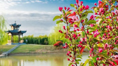 在綠樹成蔭的西寧市園林植物園,陽光從樹枝間的縫隙傾瀉而下。公園里,游人們或坐在石凳上休息,或在樹蔭下健身,嬰兒車?yán)锏暮⑼露赝恢晔㈤_的榆葉梅。