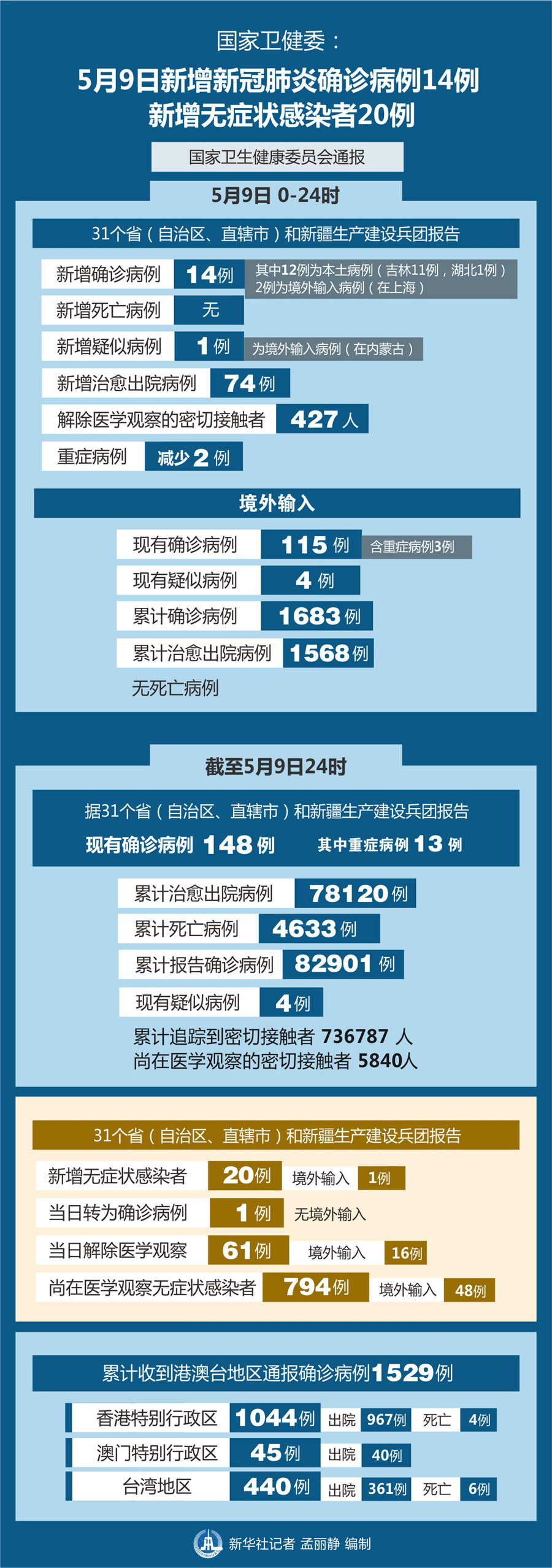 新華社北京5月10日電(記者陳聰)國家衛生健康委員會10日通報,5月9日0—24時,31個省(自治區、直轄市)和新疆生產建設兵團報告新增新冠肺炎確診病例14例,其中12例為本土病例(吉林11例,湖北1例),2例為境外輸入病例(在上海);無新增死亡病例;新增疑似病例1例,為境外輸入病例(在內蒙古)。