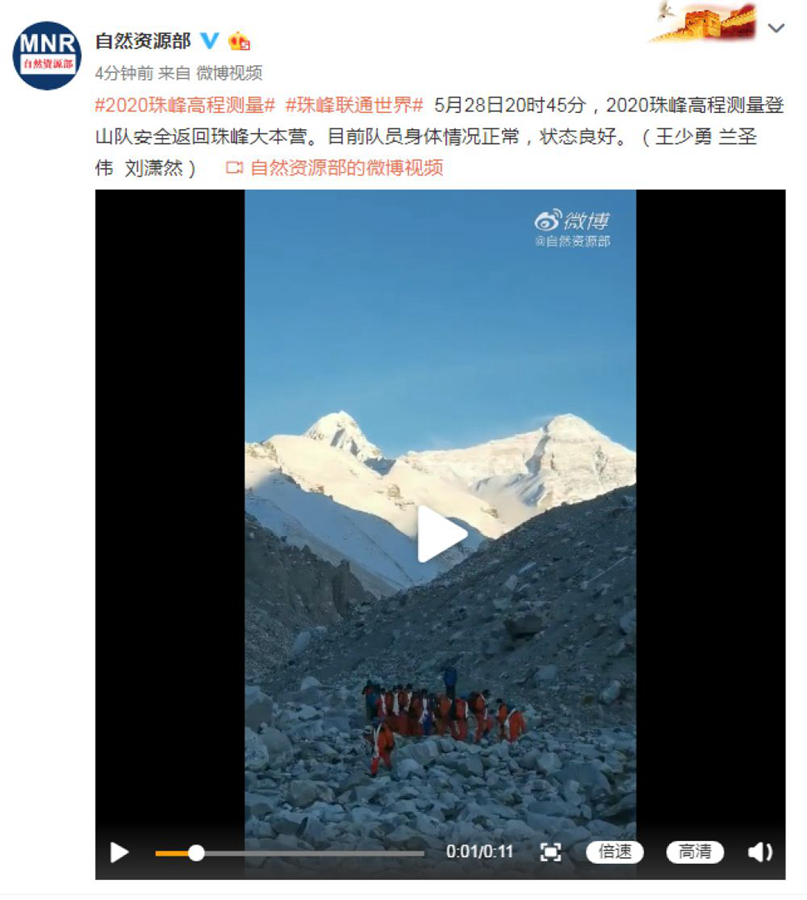 珠峰高程測量登山隊安全返回珠峰大本營