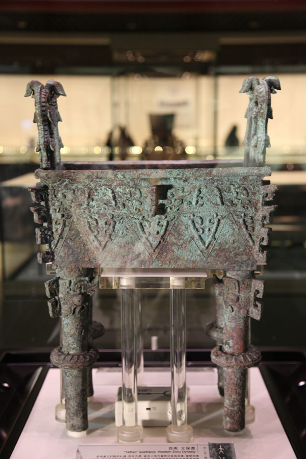 “從形制大小來看,有別于三足圓鼎,這件四足方鼎應(yīng)該是西周早期貴族所用的器物。方鼎高50.7厘米、口徑23.36厘米、重26公斤。方鼎的腹部內(nèi)壁上清晰地鑄有‘大保鑄’三字銘文。據(jù)考證,這‘大保’二字其實應(yīng)該為‘太保’,因此這件方鼎被稱作太保鼎。”陳卓說。