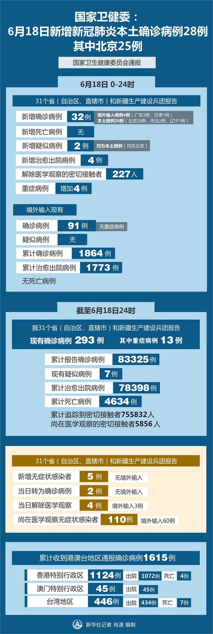截至6月18日24時,據31個?。ㄗ灾螀^、直轄市)和新疆生產建設兵團報告,現有確診病例293例(其中重癥病例13例),累計治愈出院病例78398例,累計死亡病例4634例,累計報告確診病例83325例,現有疑似病例7例。累計追蹤到密切接觸者755832人,尚在醫學觀察的密切接觸者5856人。