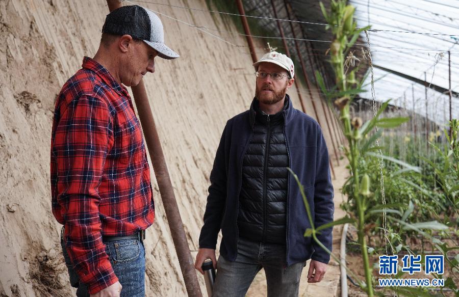 摩根(左)和丹尼爾在西寧市總寨塬高原型現代都市農業科技示范園的蔬菜大棚內聊天(2019年11月12日攝)。新華社記者吳剛攝