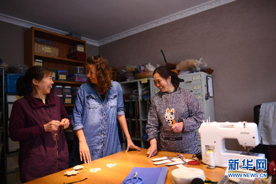 在青海省西寧市,安鵬的妻子(中)在自己的手工藝工作室內和手工藝人交談(2019年4月19日攝)。新華社記者張宏祥攝