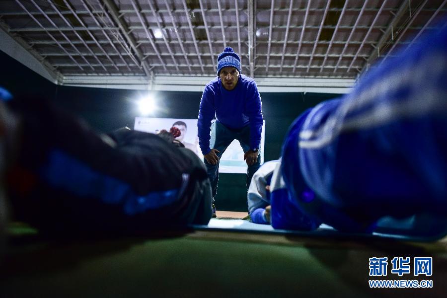 在青海省海東市互助土族自治縣的網球場內,喬西·羅賓遜帶領學員進行拉伸運動(2019年11月7日攝)。 新華社記者吳剛攝