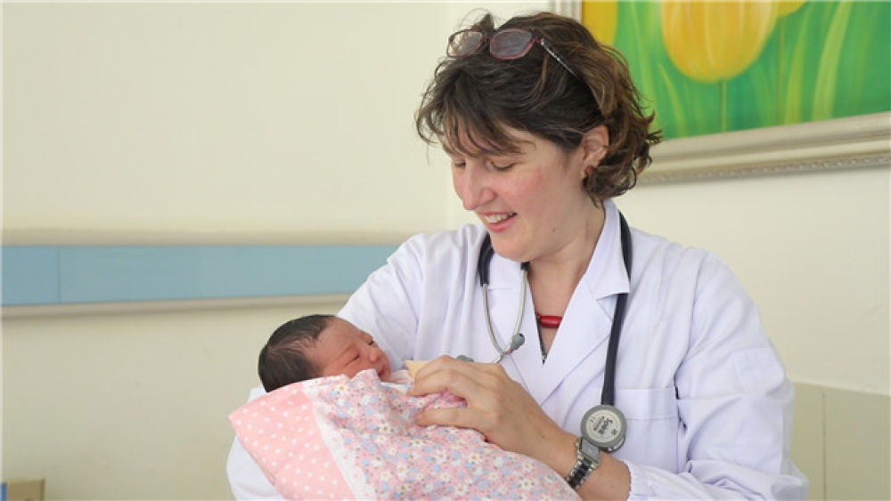 鞠瑞欣在青海紅十字醫院病房內為一名新生兒做檢查(2019年10月18日攝)。新華社記者 趙玉和 攝
